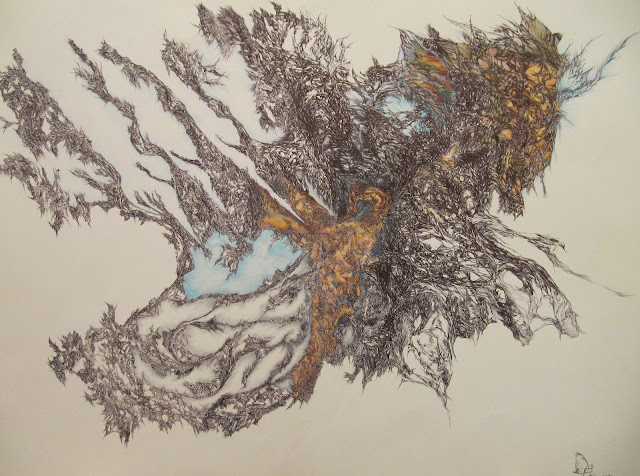 Hard to Handle, Amorphism of The Dead & the Finger Lakes. 2009. Daniel Falk. New York. Pen on paper.  A piece that amorphically mirrors the pattern of New York's Finger Lakes and the improvisational musical patterning of The Grateful Dead's 1971 Hollywood Palladium show, in which the version of their popular cover of Hard to Handle was played with dark, rich undertones that flowed into each song part with five distinct players (Micky Hart, an original drummer, left the band for a 5-year hiatus in February of 1971); finding the band expressing and interacting around a central song structure and extending their rhythmic and musical communication in harmonizing patterns that are temporary, generative and fluid.  Geographic patterns like the Finger Lakes show external markings, yet contain mostly unseen influences that "improvisationally" crafted an opening .  The Dead's performance combining wisdom, ease, and insight, is reductively considered from vast hidden sources as: Artful Structural Crafting, a creative expression model I've identified to label elements present in making art pieces memorable.  The Finger Lakes pattern are the white vertical sections towards the bottom of the piece.  Both, the Dead's lead singer Pig Pen and lead guitarist Jerry Garcia performance finds them synched together in a high degree (no pun intended!) producing a mythical tangle of cobalt mesomorphs stirring golden flour in a surging sticky grasp of velvet-fanged musical tides, believing in itself and journeying cellularly and focally to a faraway land with a long coat-tail on which to dance with them.  In similar creative spontaneity, the Finger Lakes appear like a lion claw's scratch mark, indelibly defining space and time.